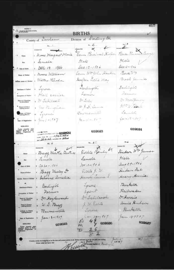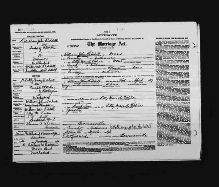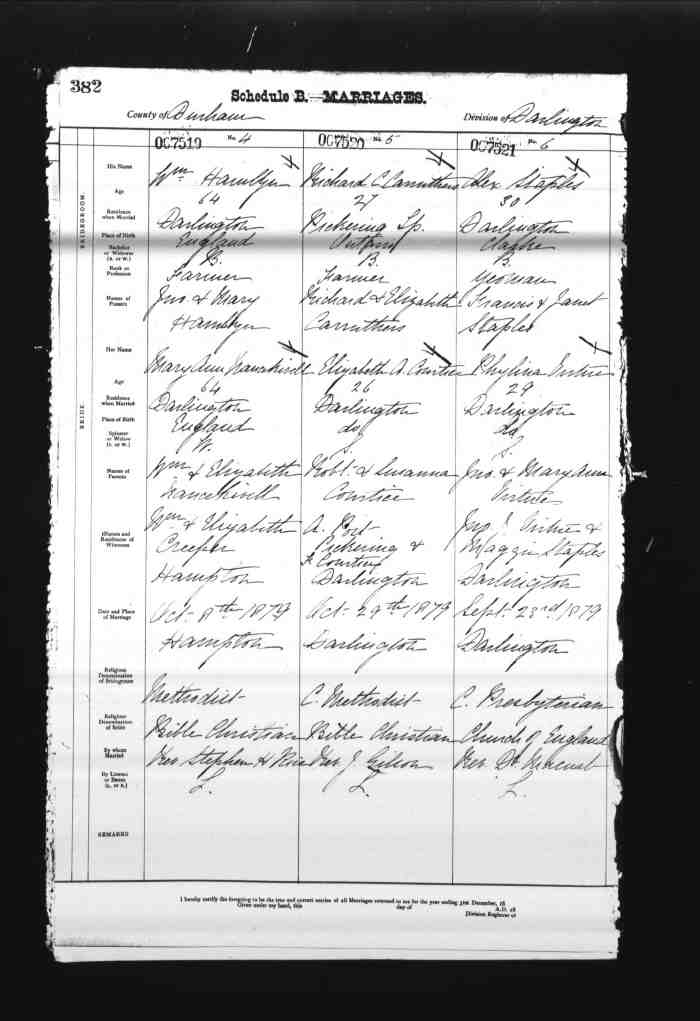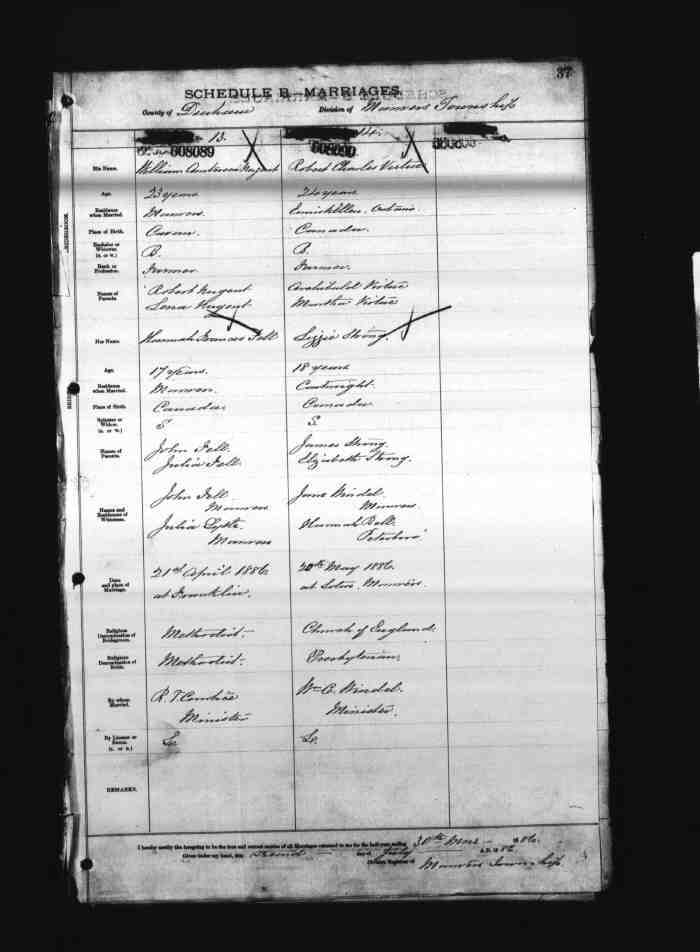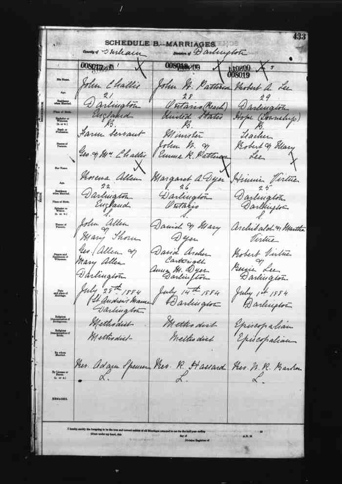 When William came to Darlington Township, Ontario, it is unknown where they first settled but by 1860 he was settled on Lot 4, Concession 7 in Darlington Township in what was known as the village of Tyrone a short distance from his parents in Enniskillen. Land records for that property show that the original grant for 100 acres on the North 1/2 of Lot 4, Concession 7 was to John Morty in 1802. John Morty had received the free land grant because he was a member of the Butler's Rangers. He was granted 300 acres, of which this property in Darlington made up 100 acres. Just where the other 200 acres is located is unknown at this time but John Morty lists his residence on the sale of the property as Niagara District.