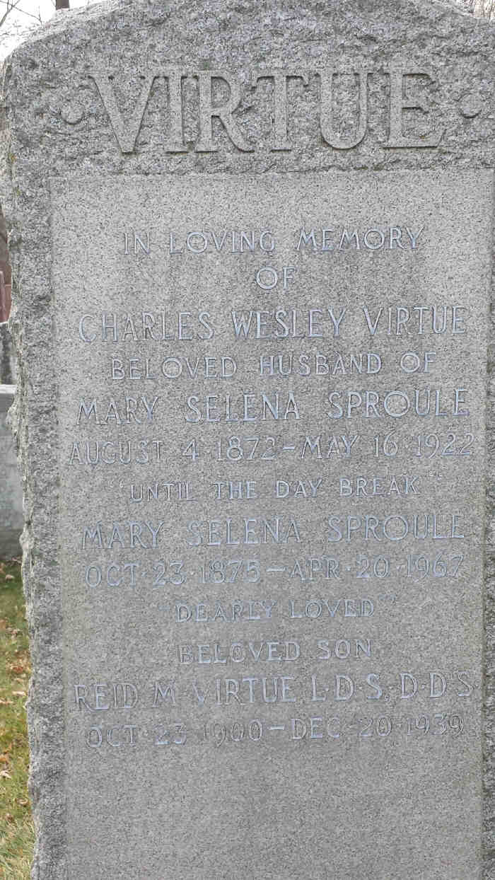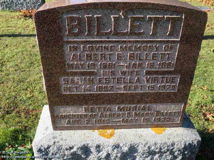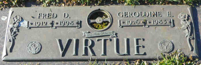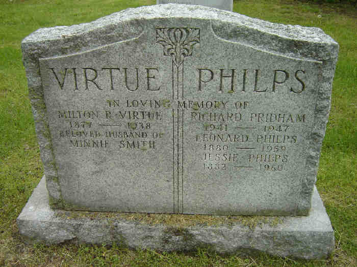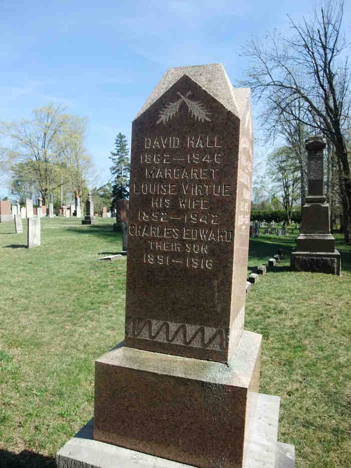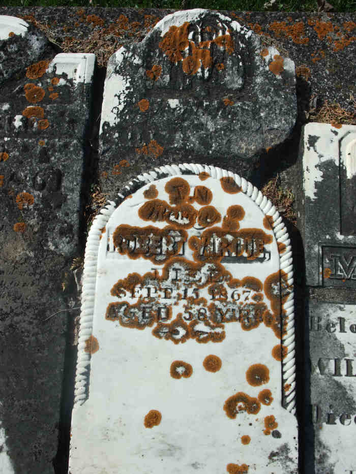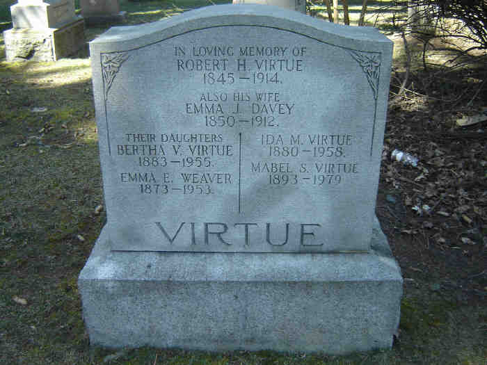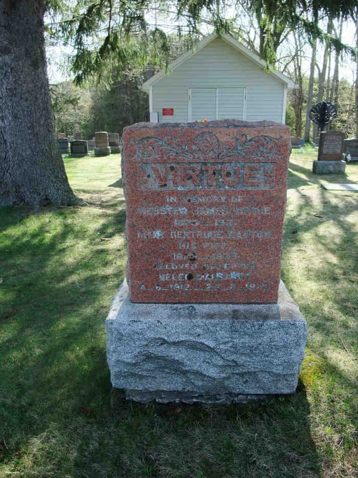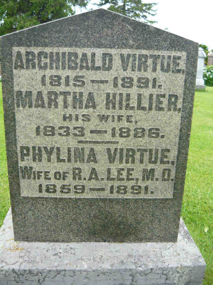 Robert Virtue died on the 16th September, 1861 and is buried in the Cemetery mentioned above. His wife Phylina is also buried there but her date of death is unknown as her stone has been mostly illegible for some time with only "ina" left on her tombstone. But, her death must have been before 1869 when the province started requiring deaths to be registered.