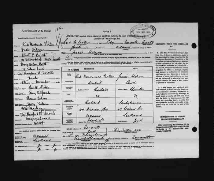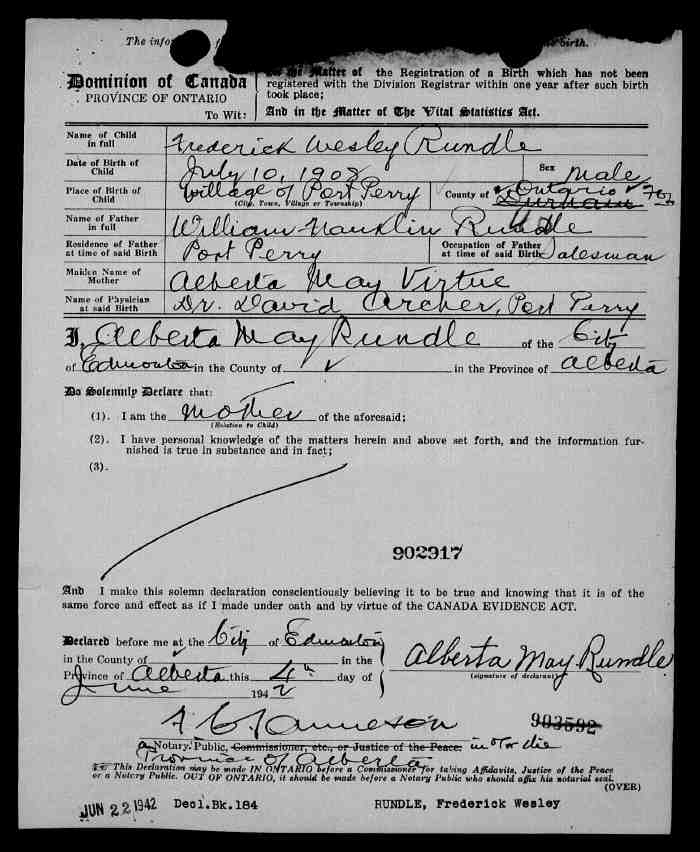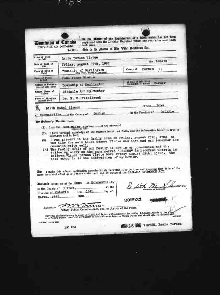 General Notes: Information about the earlier years of the Virtue family carried down from generation to generation is that; they came from Northern Ireland to Canada; there was some Dutch origin; they originally came from France; and some were landed gentry there. One could assume they came from France to Holland, to England and/or Scotland then to Ireland. Family story says they migrated from Enniskillen, County Fermanagh, Northern Ireland, to Ontario, Canada in the early 1800's, probably some time after 1835 when his son William's second child was born and 1844 when Robert's second son John was married in Hampton, Darlington Township, Ontario, Canada to Mary Ann Gallagher. The first documented record that I have uncovered at the present time is a land record that places Robert and his sons, John, Robert and Archibald on Lot 17 & 18, Concession 8, Darlington Township, Ontario, Canada as of 13 Sept., 1849. Where they lived previous to that is unknown at this time.