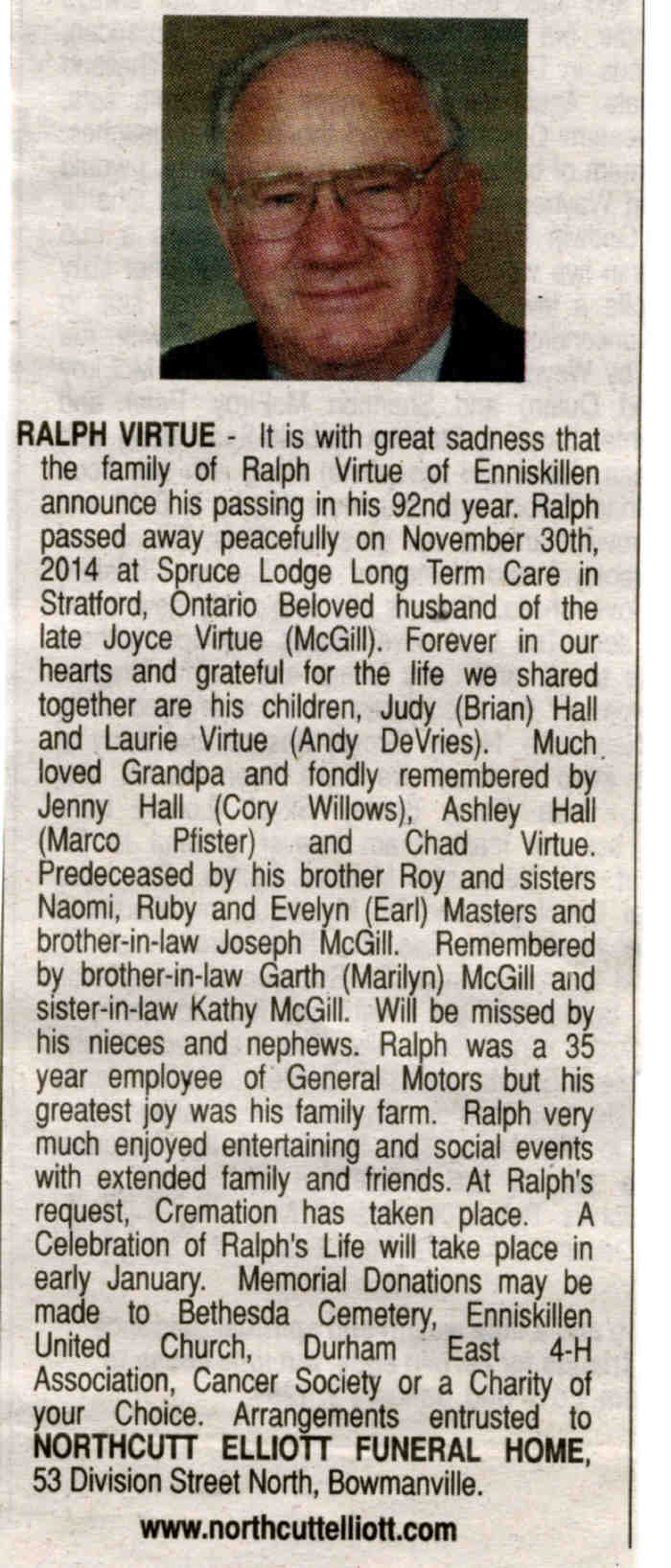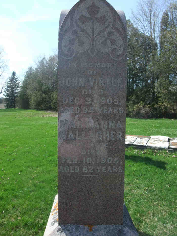 General Notes: John Virtue, son of Robert and Philina (Morrison) Virtue was born in 1812 in Edinburgh Scotland. He came to Canada with his parents about 1840's and after his marriage to Mary Anna Gallagher took up residence in Enniskillen, on the northern section of the original homestead of his father Robert. He had nine children, all born in Enniskillen.