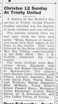 John James Virtue was one of the last people's wardens of the church. The minister came from Bowmanville, ten miles away, and in time the church was closed. John James Virtue cared for the cemetery until his death. A daughter of his, Sarah (Sadie) Virtue Billett, had the care for the next 47 years. Dorothy Pascoe Bowman, daughter of Eliza Jane Virtue of the Darlington West Virtues now, in 1978, sees that the cemetery receives care. Many of the Virtue family are buried in the cemetery. The inscriptions on the older markers are illegible now.