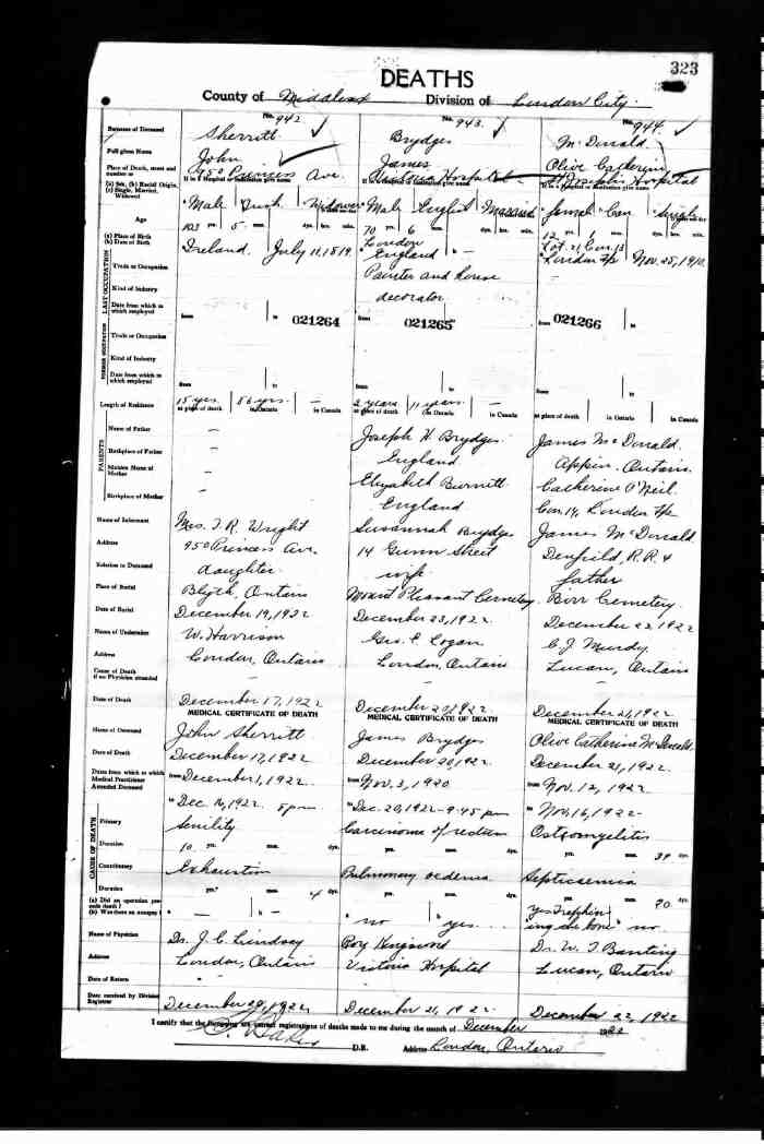 Census: age 66, b. Ireland, 1871, Tyrone, Darlington Twp, Durham County, Ontario, Canada. 97