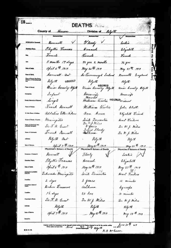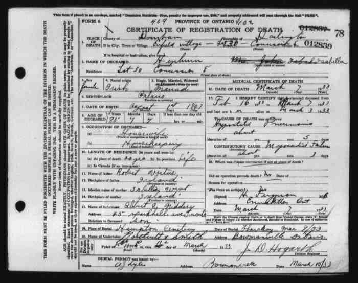 + 12 F xi. Hannah Virtue 40,81,82,83,84,85,86,87,88,89,90 was born in Mar 1828 in Ireland,87 was christened on 6 Apr 1828 in St Mary's of Ardess, Magheraculmoney Parish, Fermanagh Co., Northern Ireland, died on 26 May 1919 in Blythe, Howick Twp., Huron East, Ontario, Canada83,86 aged 91, and was buried on 27 May 1919 in Union Cemetery, Blythe, Howick Twp., Huron East, Ontario, Canada.