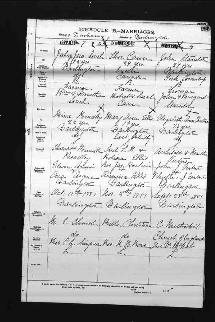 Residence: Lot 17-18, Cons. 8, Between 13 Sep 1849 and 16 Sep 1861, Darlington, Durham, Ontario, Canada. 8,9,10,11,12,13,14